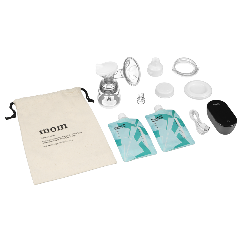 V paketu prejmete vrsto funkcionalnih dodatkov, ki vam pomagajo pri uporabi prsne črpalke in shranjevanju iztisnjenega mleka. Komplet vsebuje stekleničko za mleko (150 ml) s cucljem, 2 vrečki za shranjevanje mleka, držalo za prsno črpalko iz bombaža, univerzalni lijak, pokrovček lijaka in USB kabel.