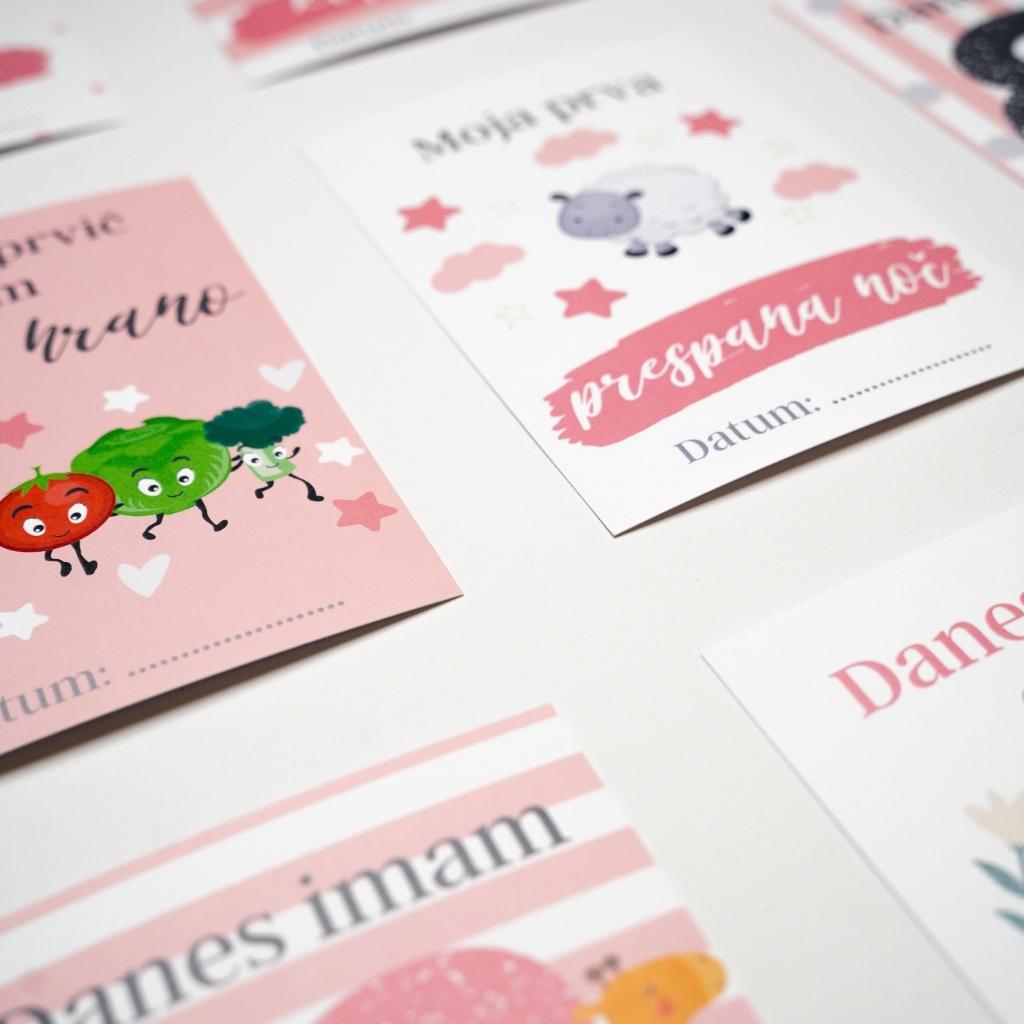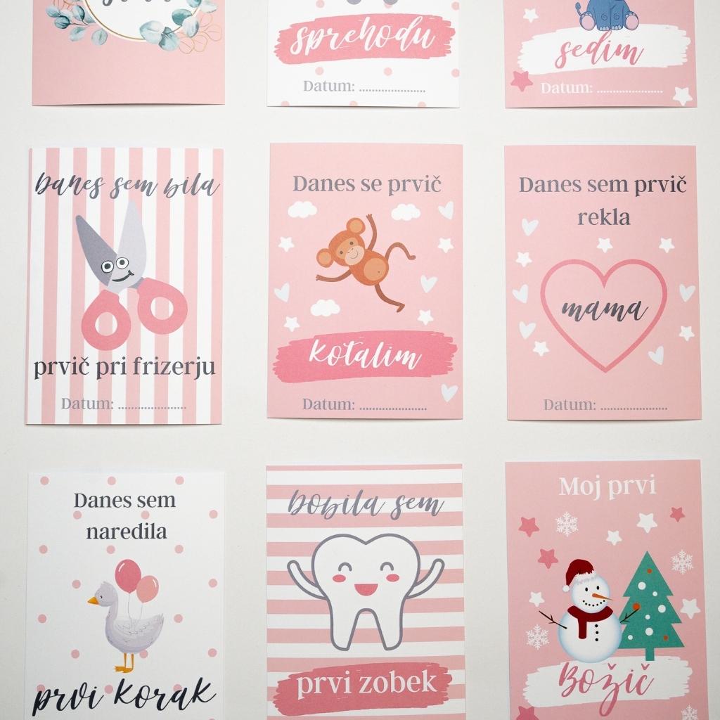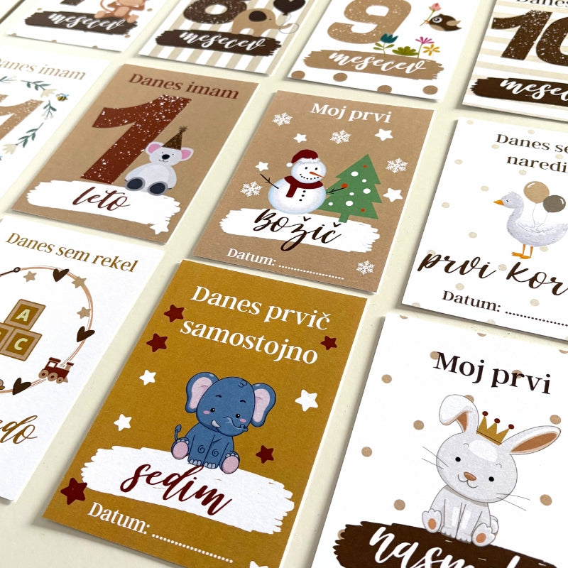 Kartice so čudovito darilo ob rojstvu otroka. V paketu prejmete 28 kartic v slovenskem jeziku; ne pozabite velikih trenutkov kot so prvi zobek, prvi sprehod, prvi Božič, prvič pri frizerju… in drugih.